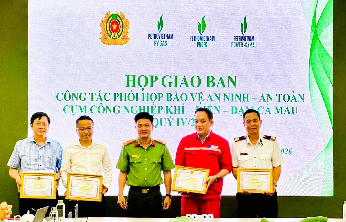 Nhân dịp này, Công an tỉnh Cà Mau đã trao quyết định khen thưởng cho các đơn vị trong Cụm công nghiệp Khí – Điện – Đạm Cà Mau, bao gồm KTN có thành tích xuất sắc trong Phong trào Toàn dân bảo vệ an ninh Tổ quốc; đồng thời trao Giấy chứng nhận đạt tiêu chuẩn “An toàn về an ninh, trật tự” năm 2025.