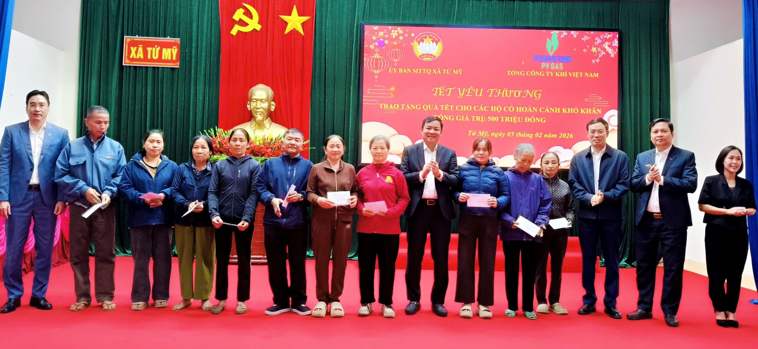 Đồng chí Nguyễn Thanh Bình – Bí thư Đảng ủy, Chủ tịch HĐQT PV GAS, đồng chí Triệu Quốc Tuấn – Thành viên HĐQT PV GAS trao ủng hộ quà Tết cho bà con xã Tứ Mỹ nhân dịp Tết Nguyên đán Bính Ngọ