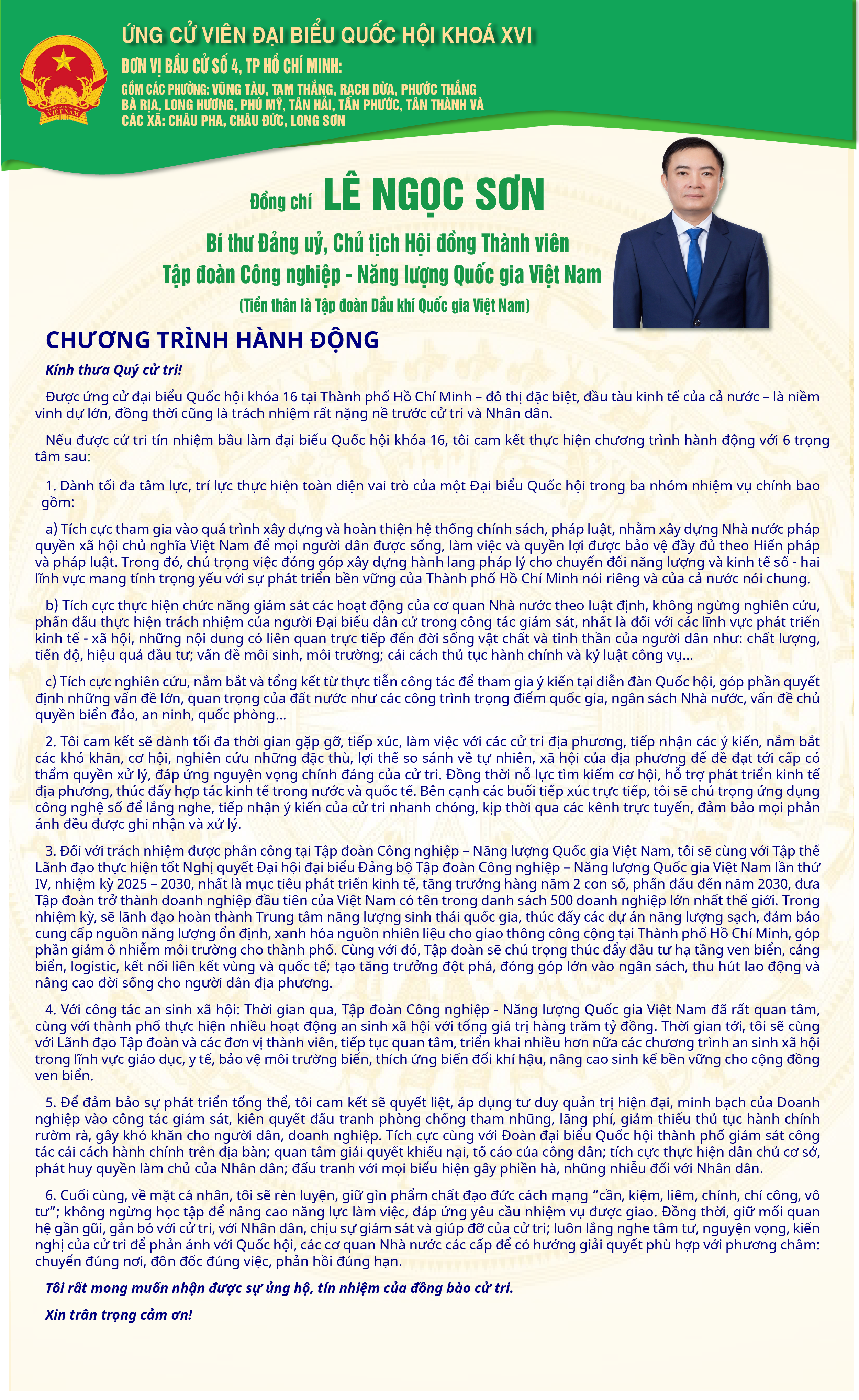 Việc đồng chí Lê Ngọc Sơn được giới thiệu ứng cử đại biểu Quốc hội khóa XVI không chỉ là sự ghi nhận đối với cá nhân đồng chí mà còn thể hiện sự tin tưởng của cử tri đối với lãnh đạo một doanh nghiệp nhà nước giữ vai trò đầu tàu trong phát triển công nghiệp – năng lượng quốc gia, góp phần quan trọng vào sự nghiệp phát triển kinh tế – xã hội và bảo đảm an ninh năng lượng đất nước.